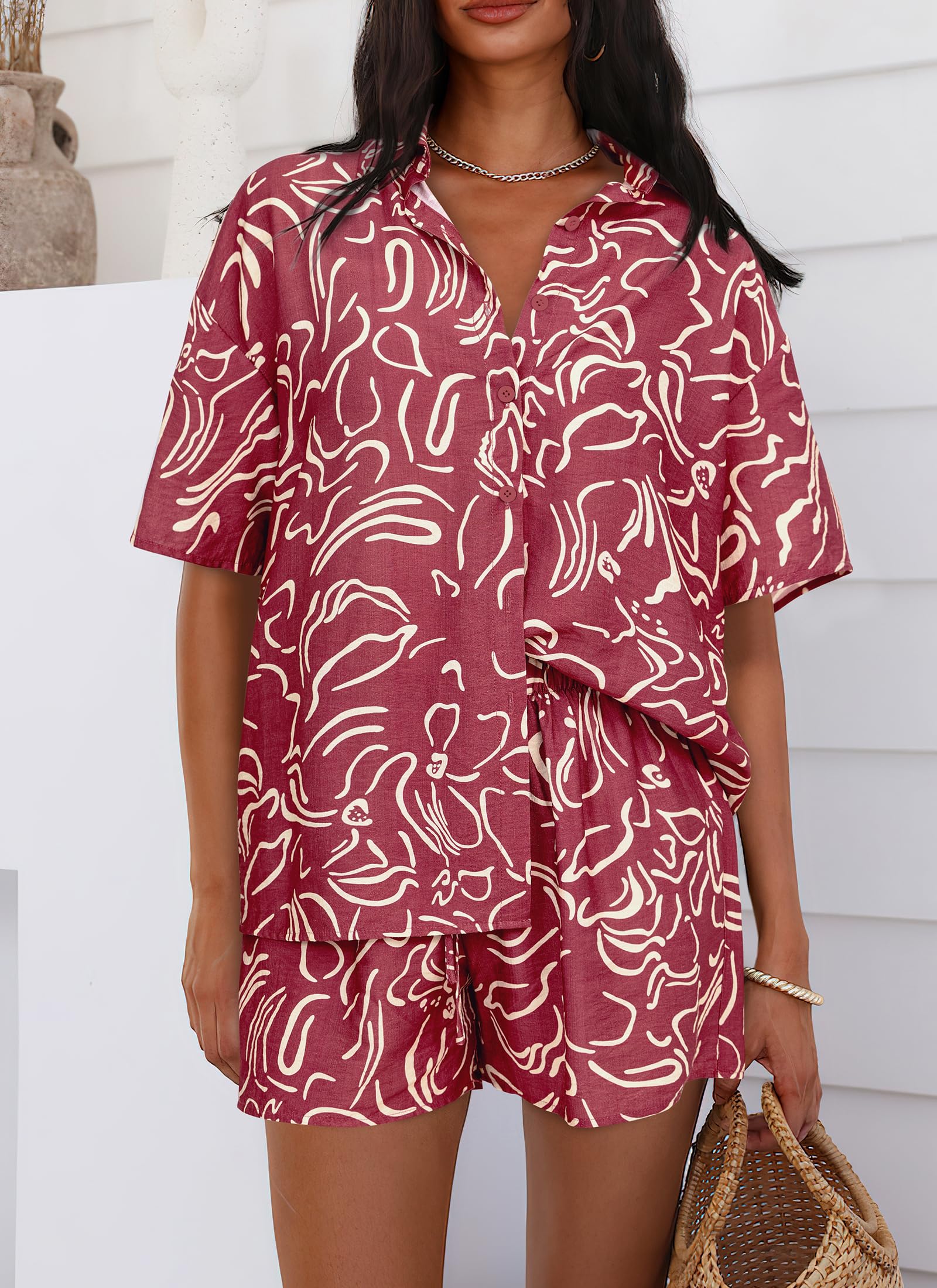 Design: Two-piece suit, button-down casual shirt, high-waisted shorts suit