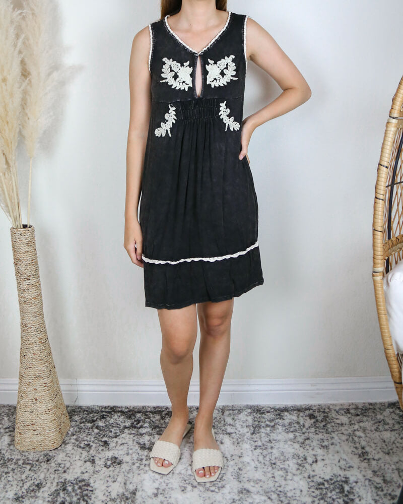 Casualdenimshorts – Acid Wash Floral Embroidery Dress – Vintage Black