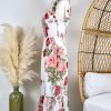 This beautifully constructed long dress features a tie strap design, smock back with hidden zipper, romantic floral prints and a chiffon like fabric design.