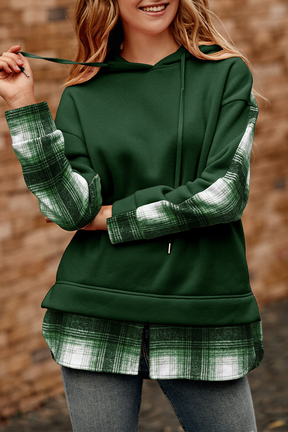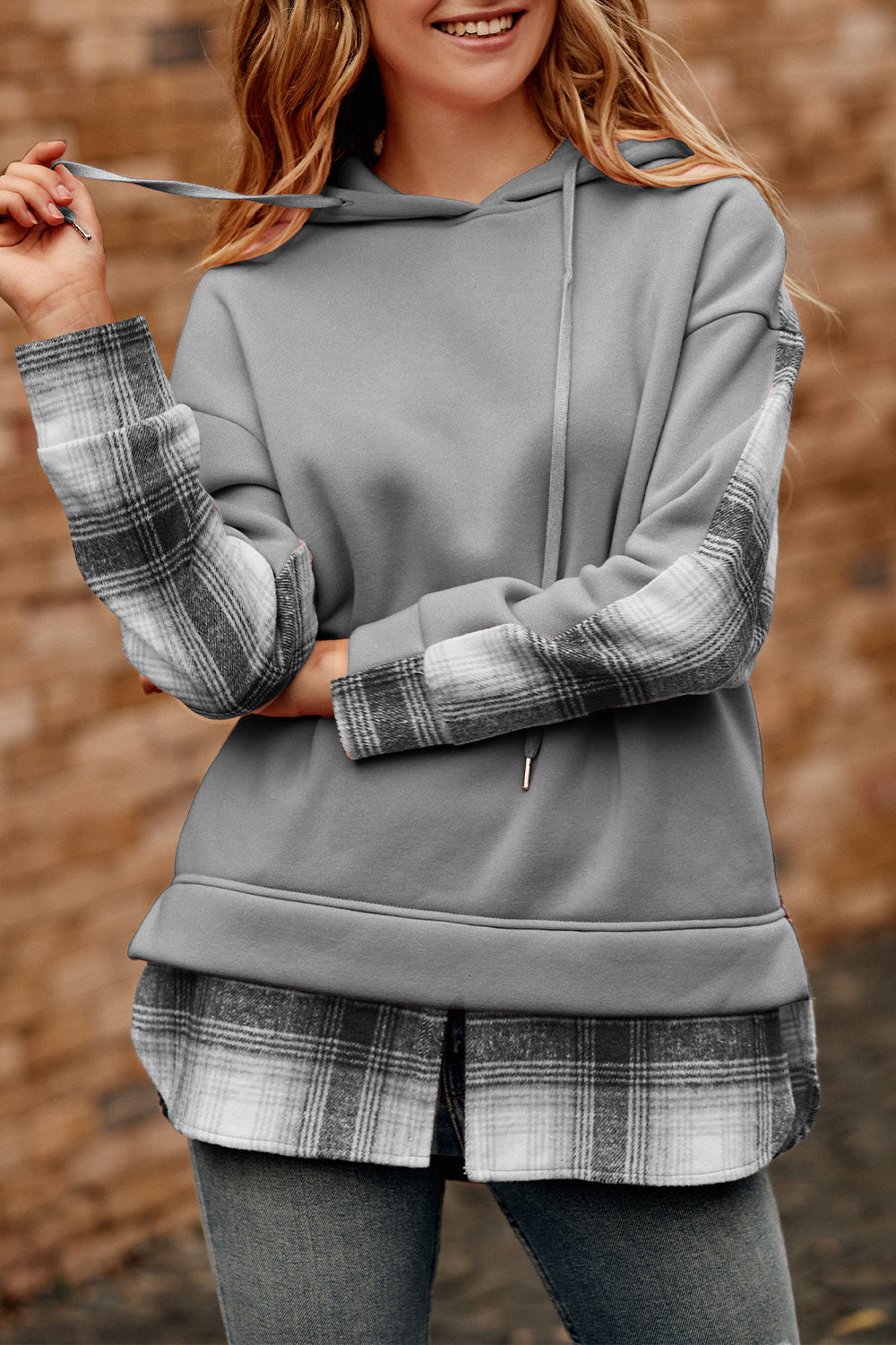 Color Block Plaid Patchwork Hooded Sweatshirt quantity