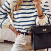 Long Lantern Sleeve Striped Ribbed Knit Pullover Top quantity