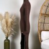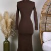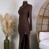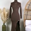 Long Sleeve Ribbed Bodycon Midi Dress With Side Slit in Brown quantity
