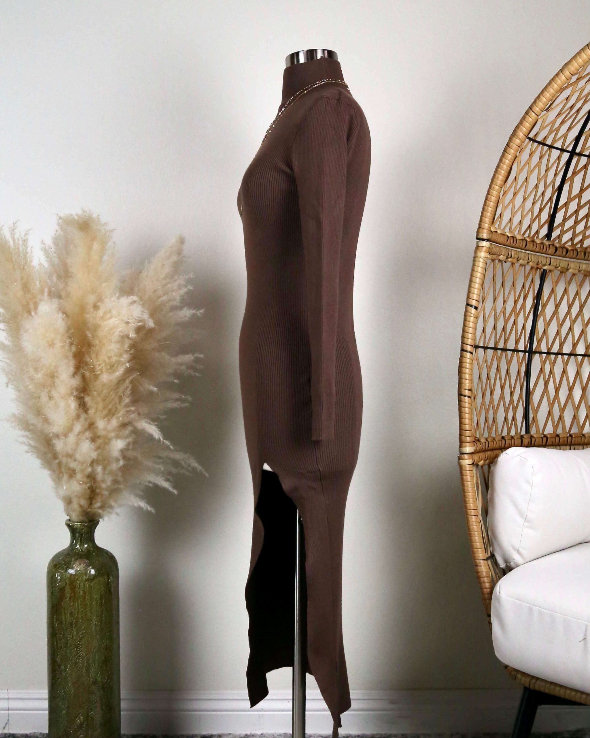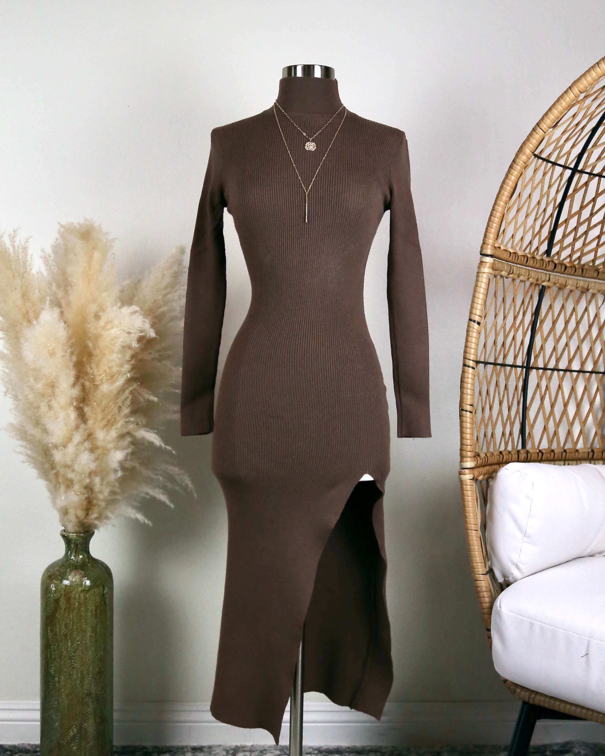 Long Sleeve Ribbed Bodycon Midi Dress With Side Slit in Brown