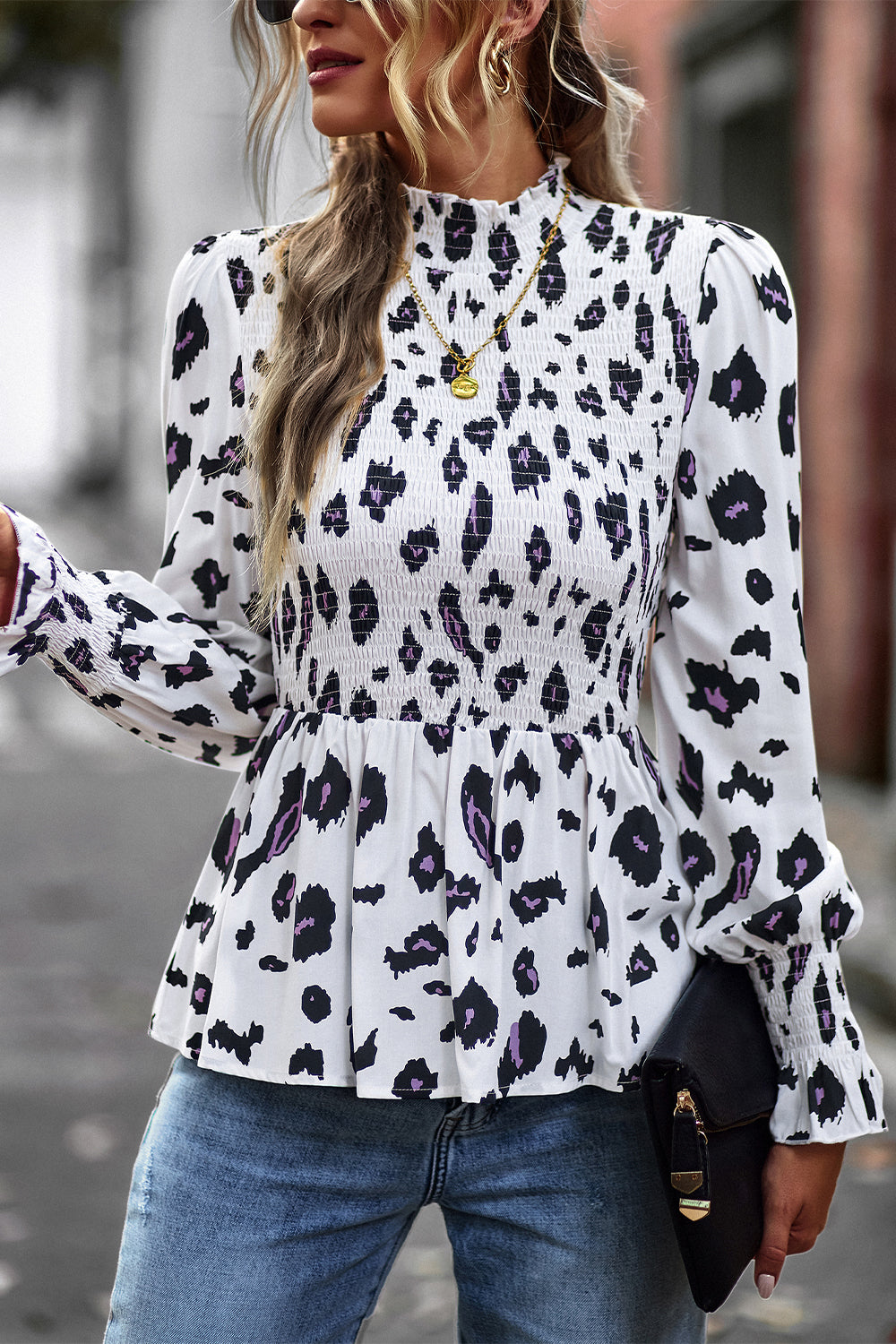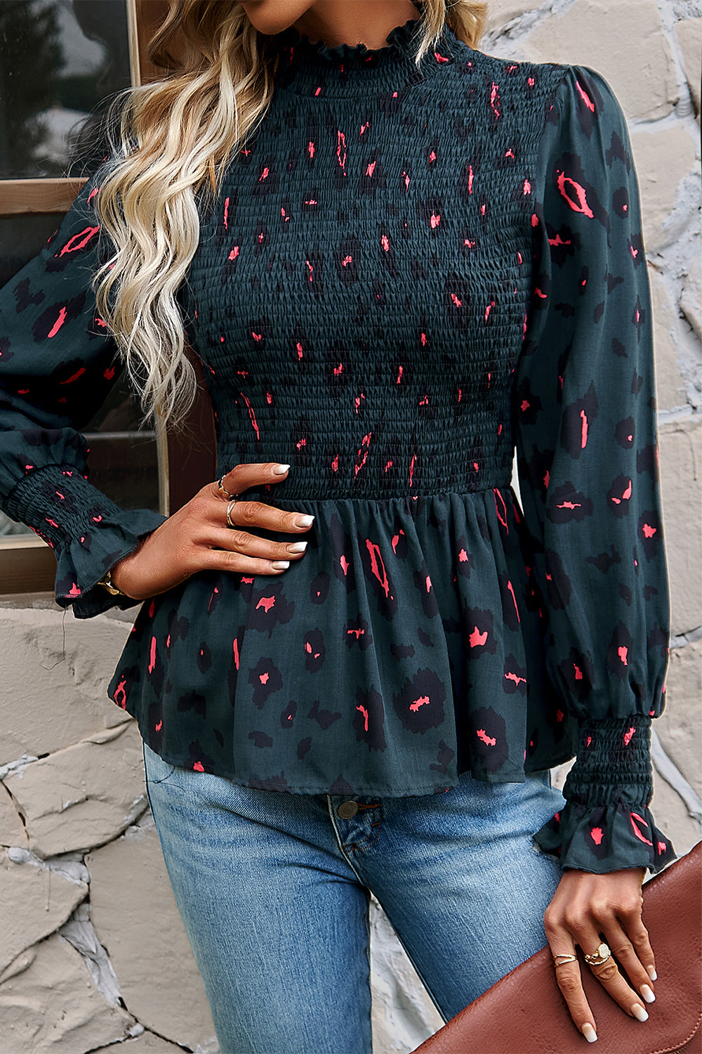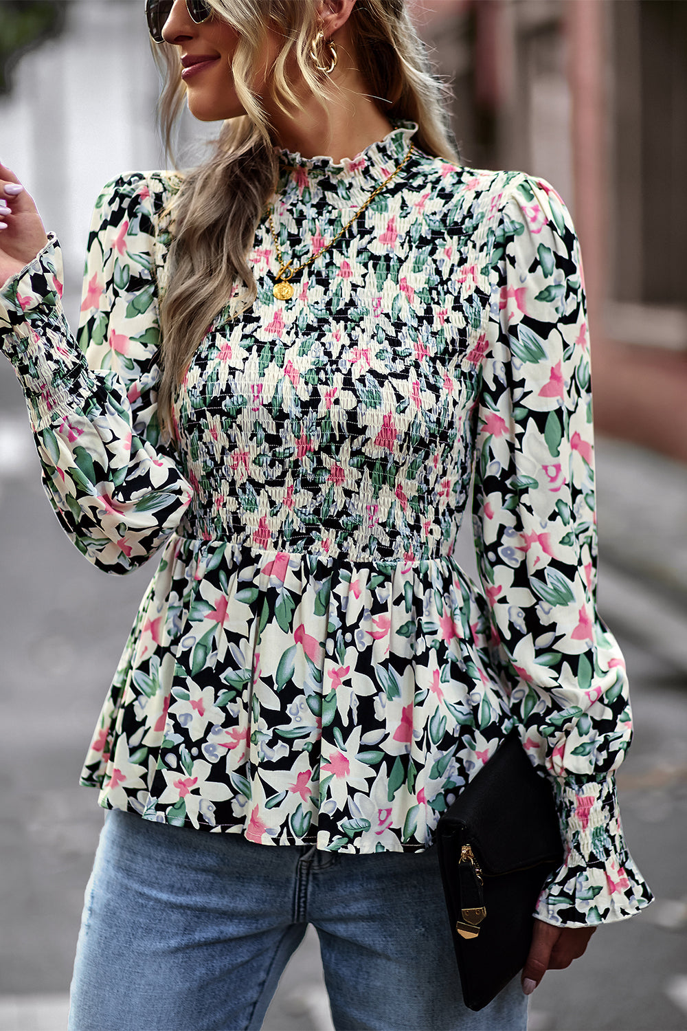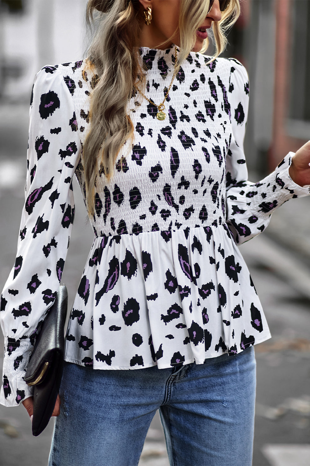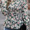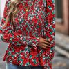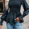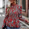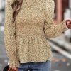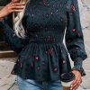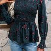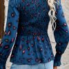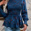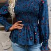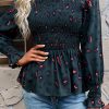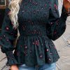 Puff Sleeve Smocked Print Babydoll Tunic Blouse quantity