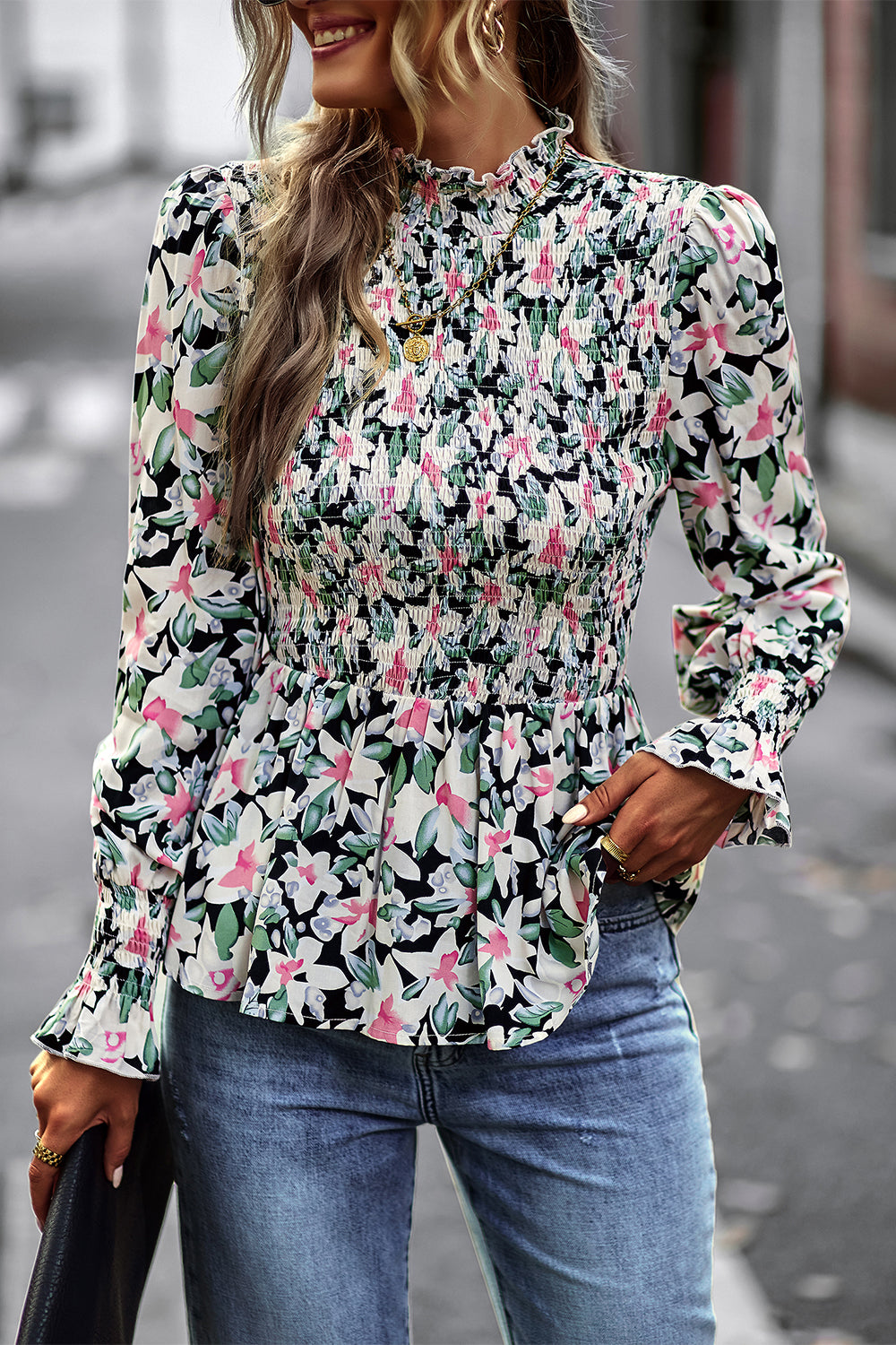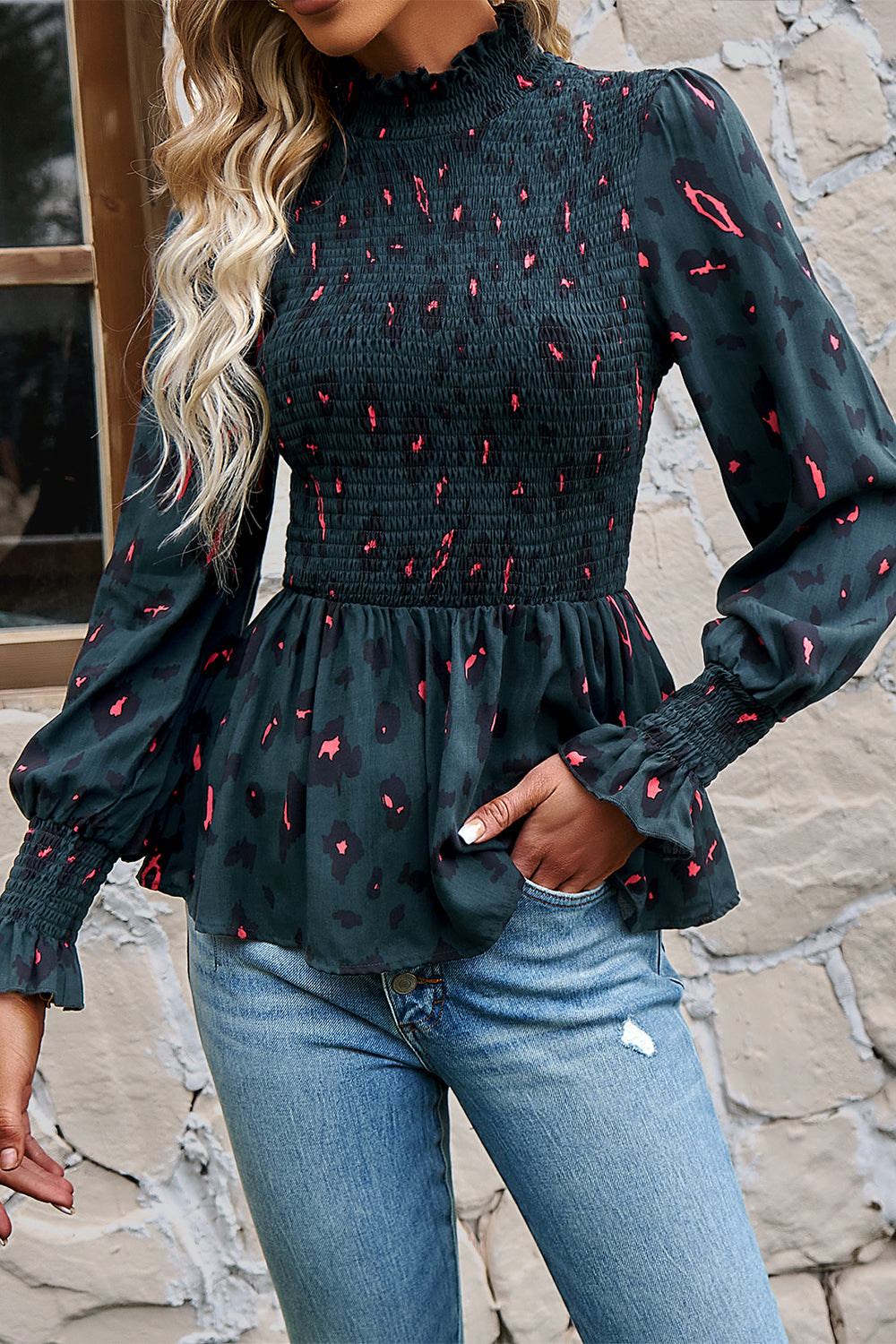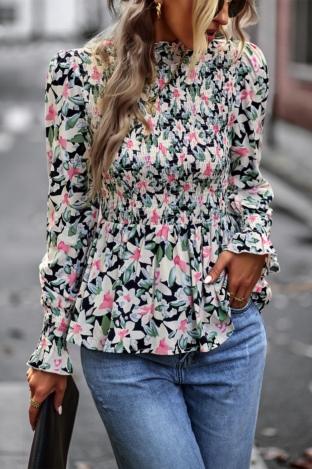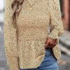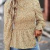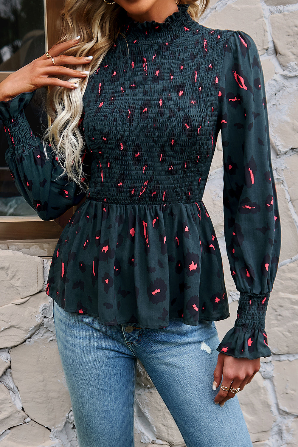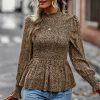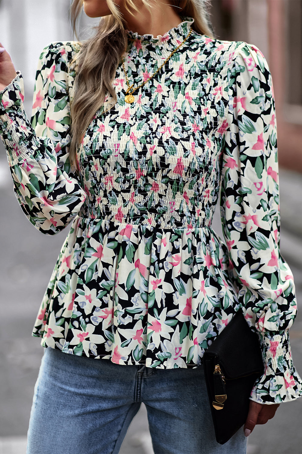 Puff Sleeve Smocked Print Babydoll Tunic Blouse quantity