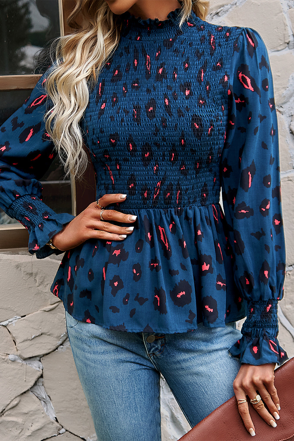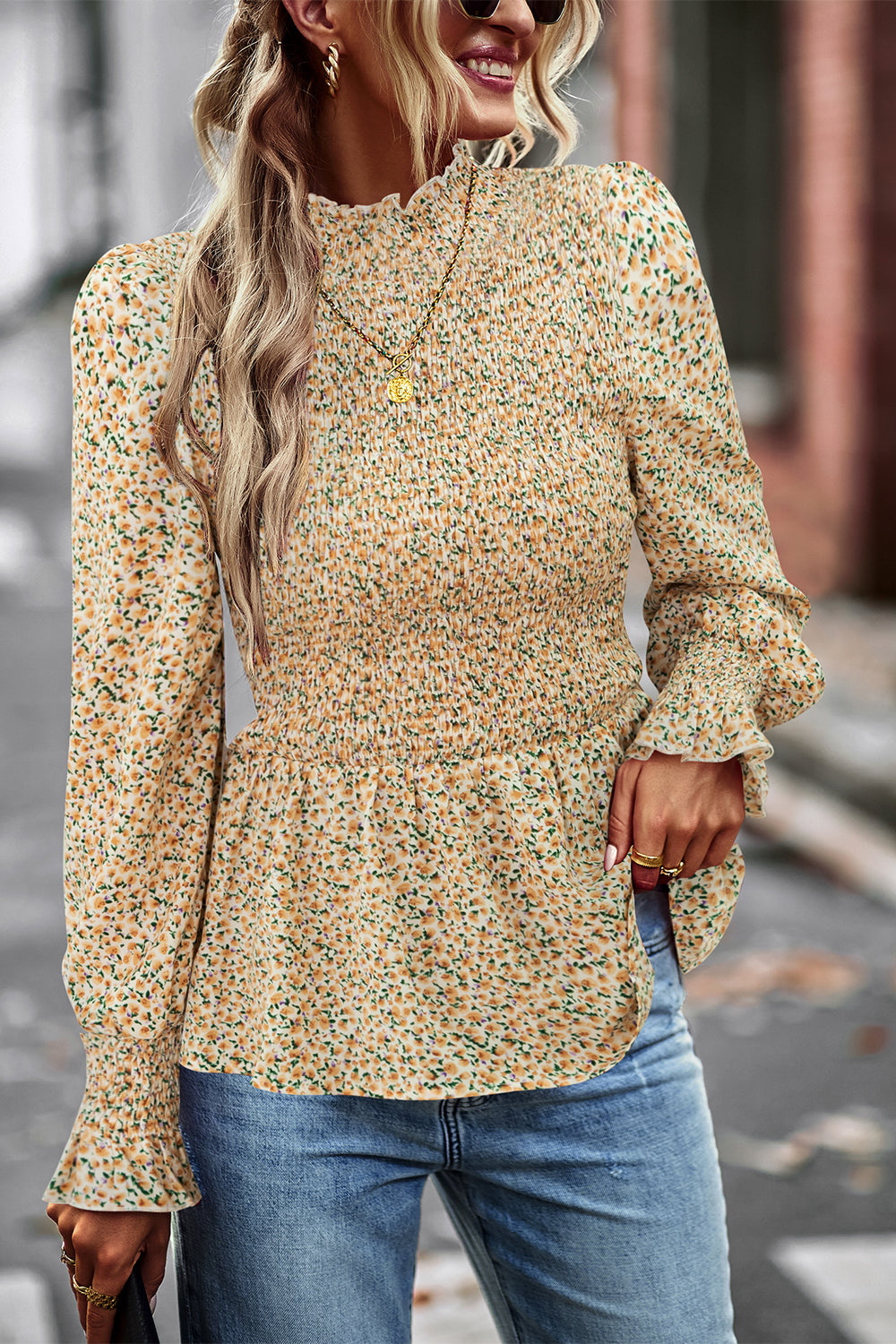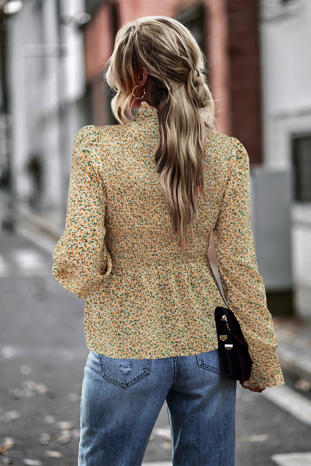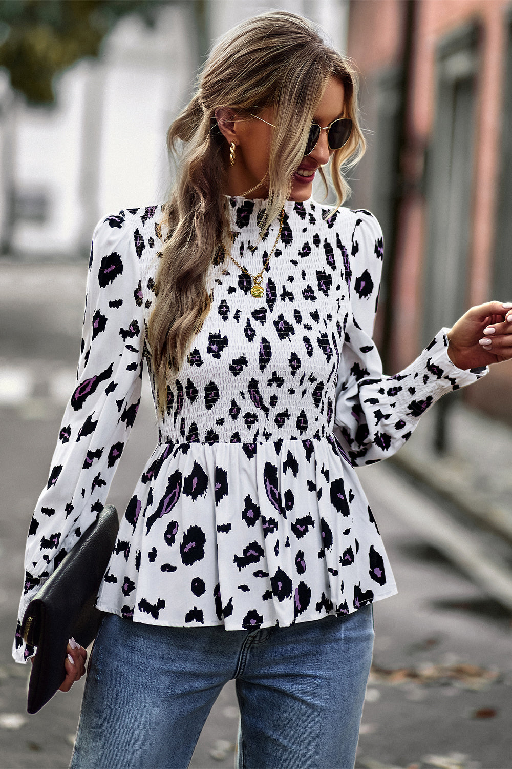Puff Sleeve Smocked Print Babydoll Tunic Blouse quantity