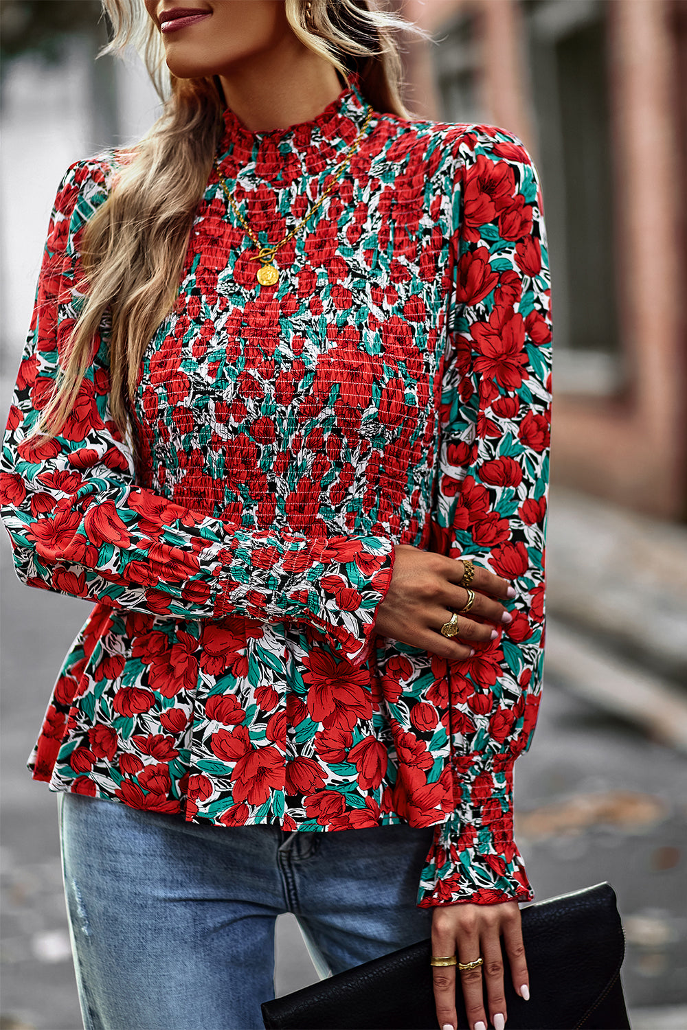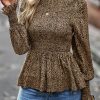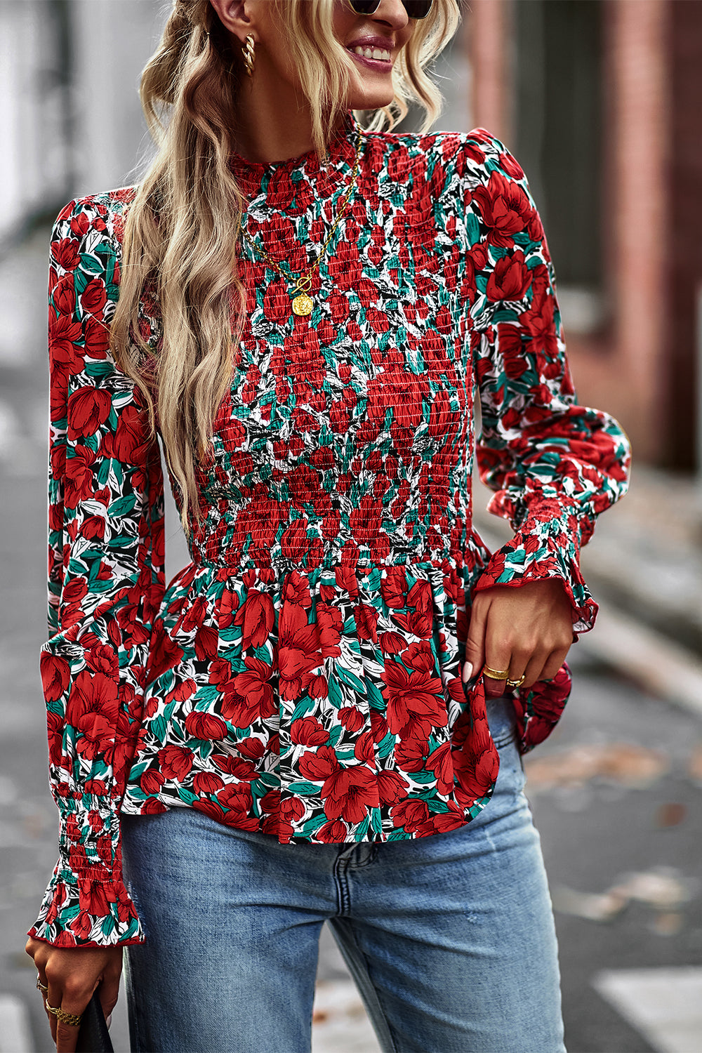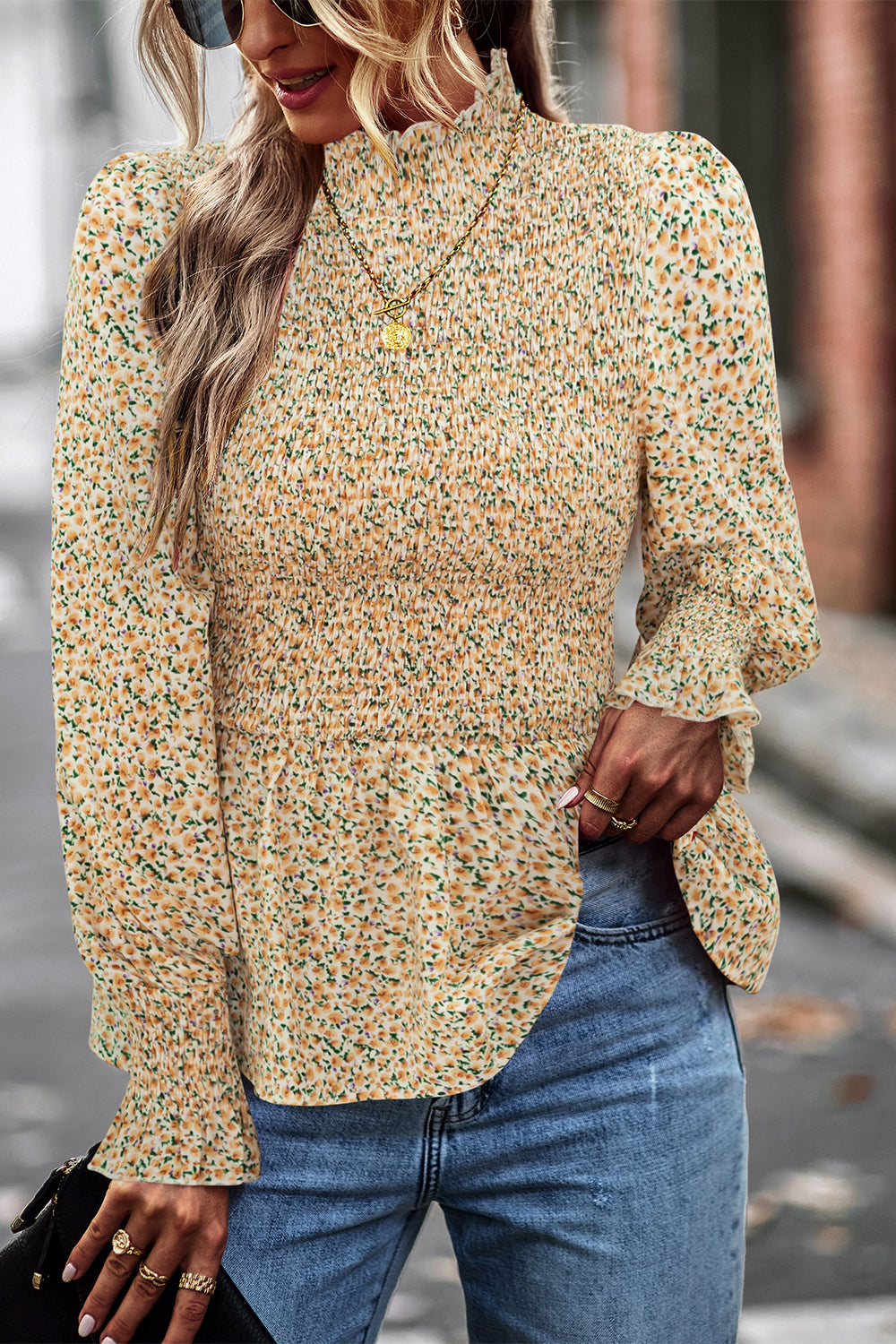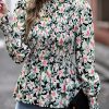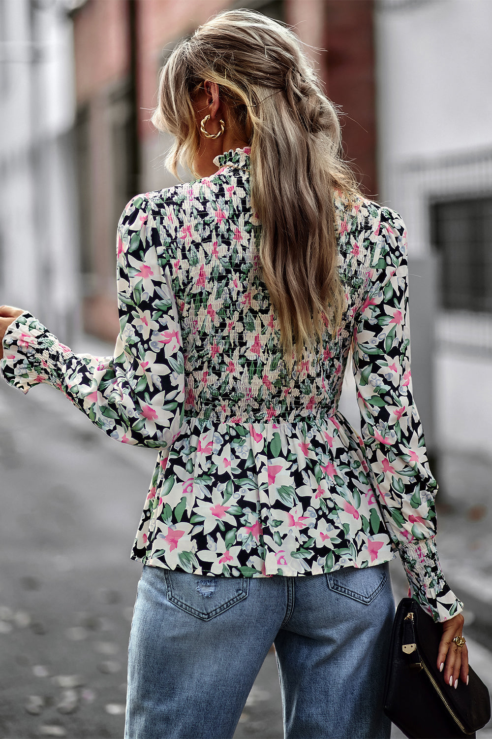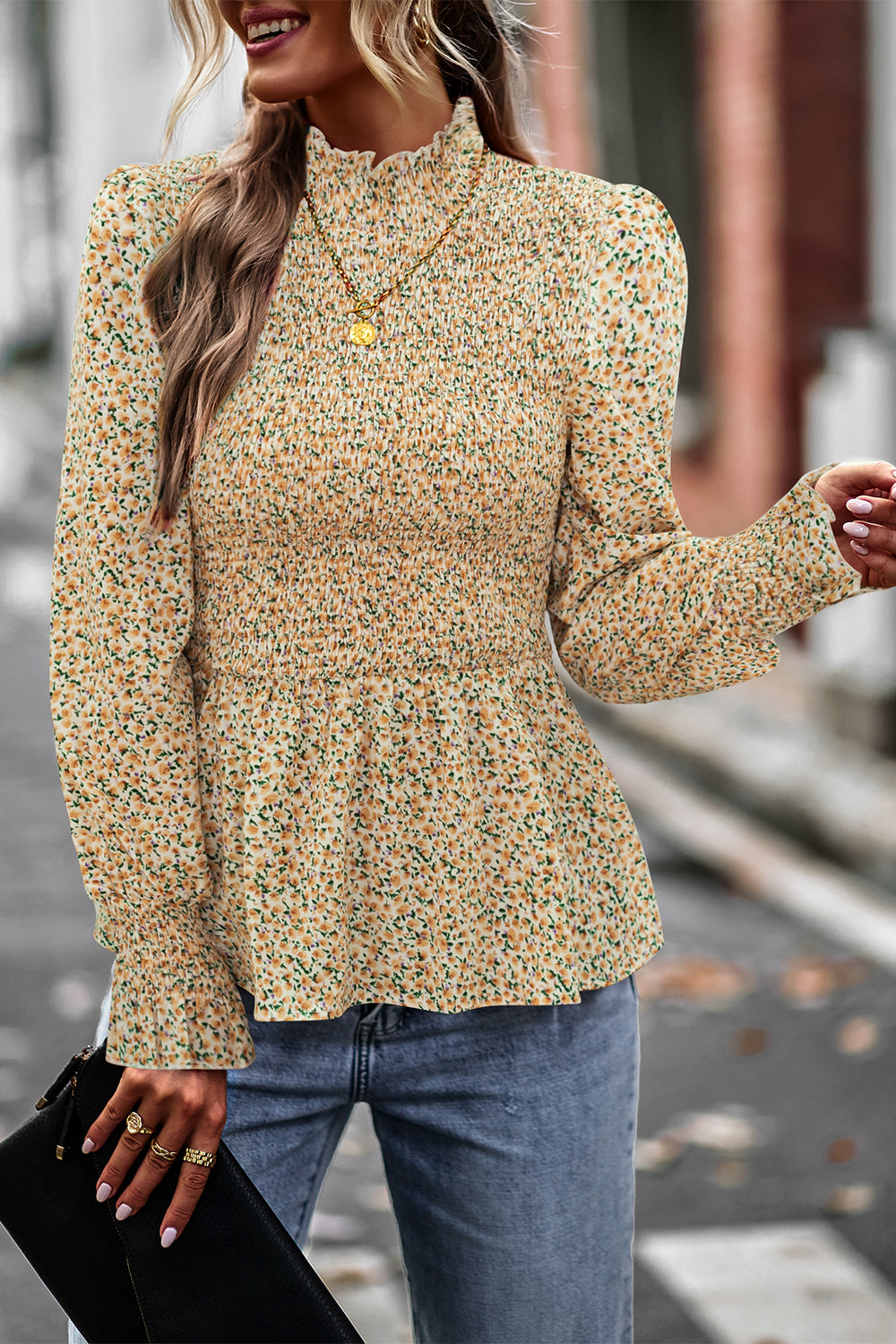 Puff Sleeve Smocked Print Babydoll Tunic Blouse quantity
