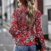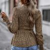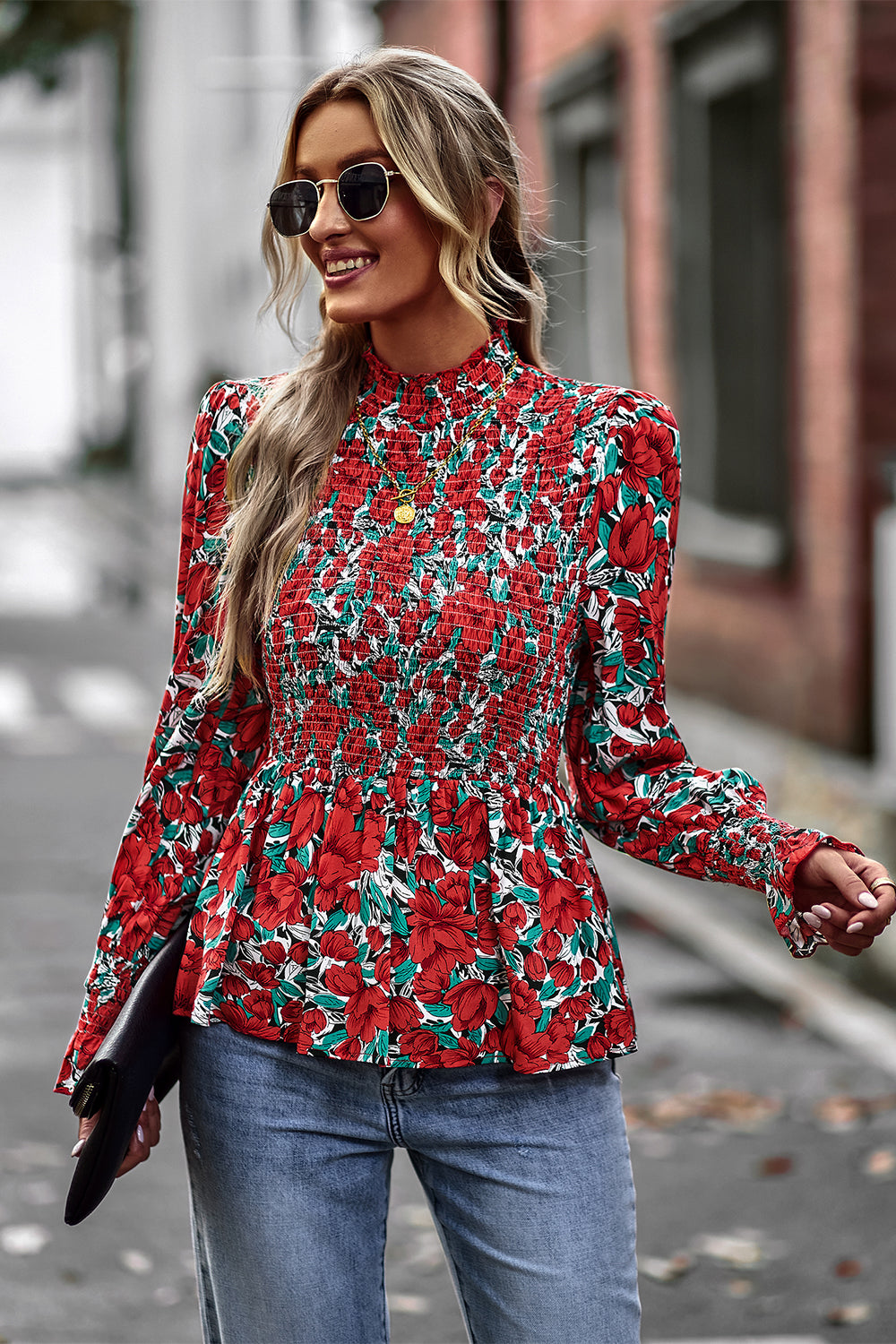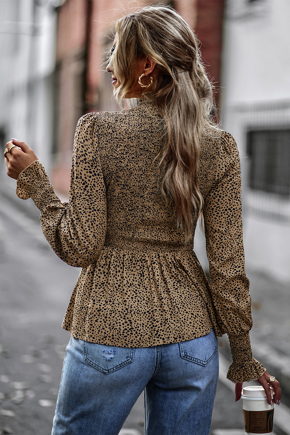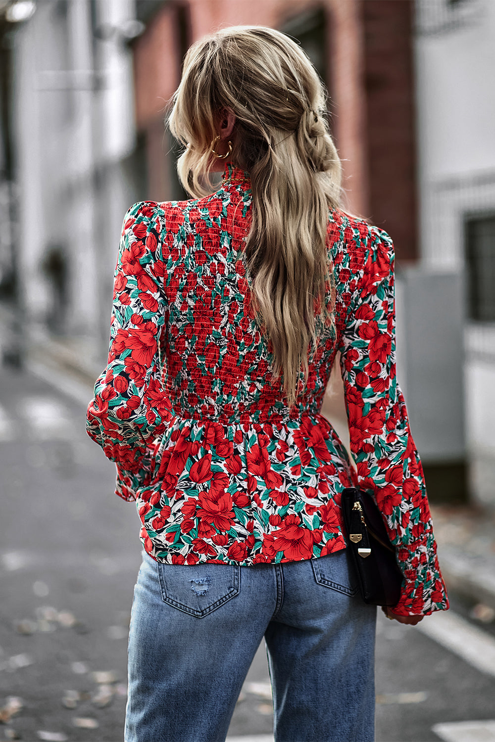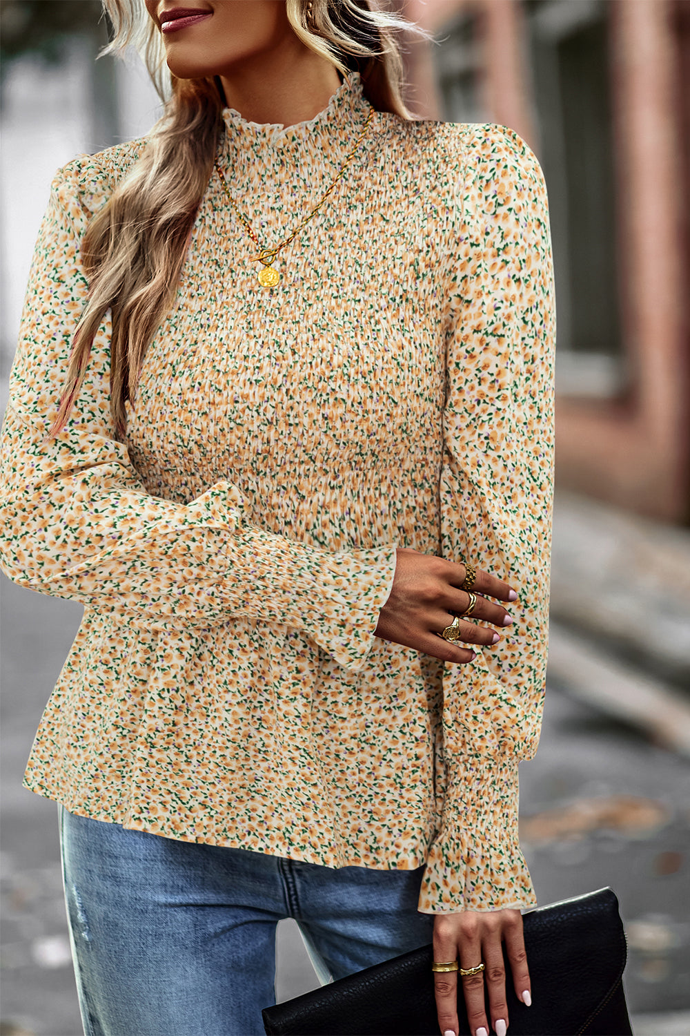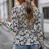 Puff Sleeve Smocked Print Babydoll Tunic Blouse quantity