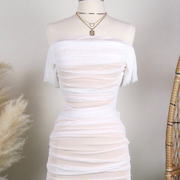 Casualdenimshorts Ruched Strapless Mini Mesh Dress in White