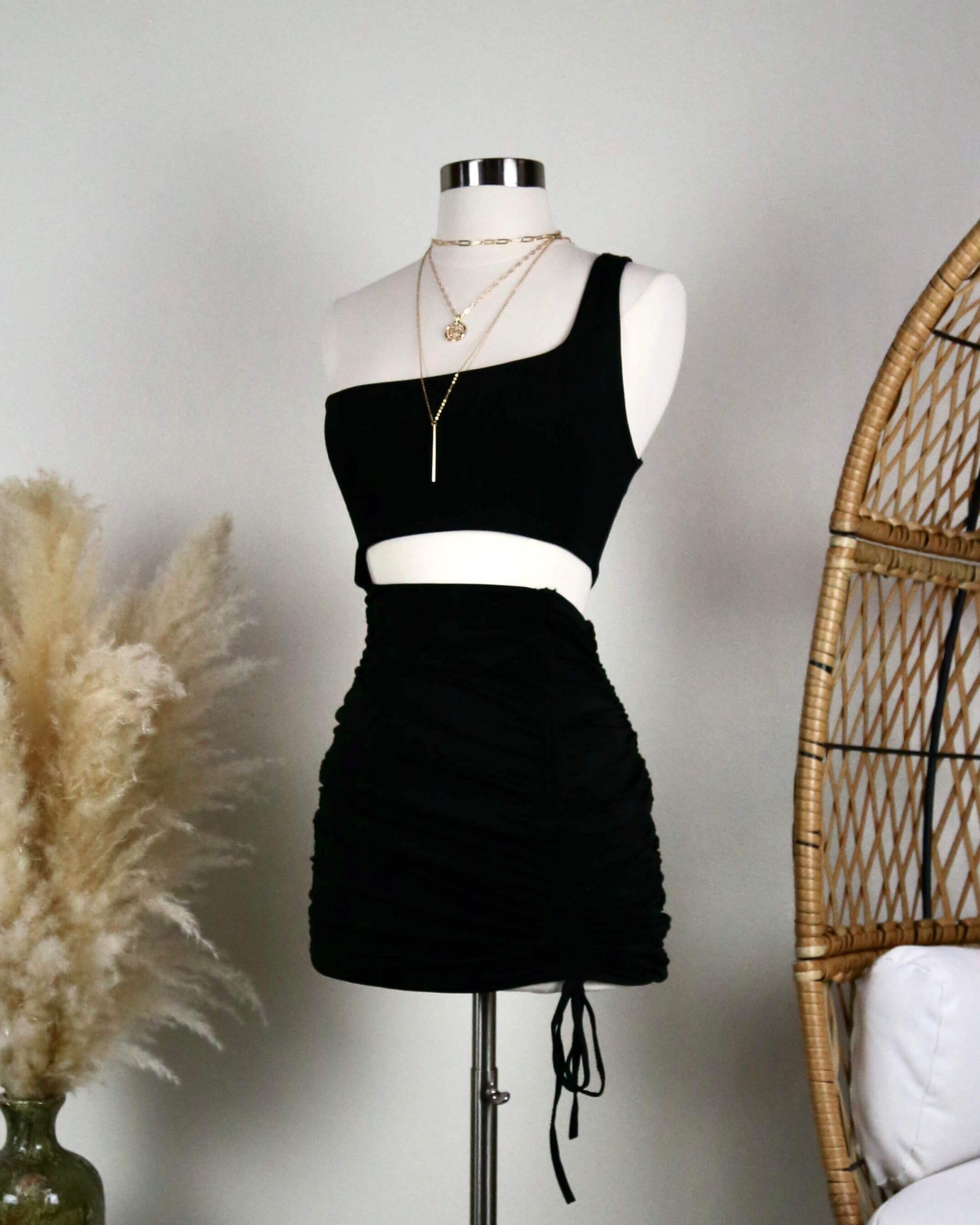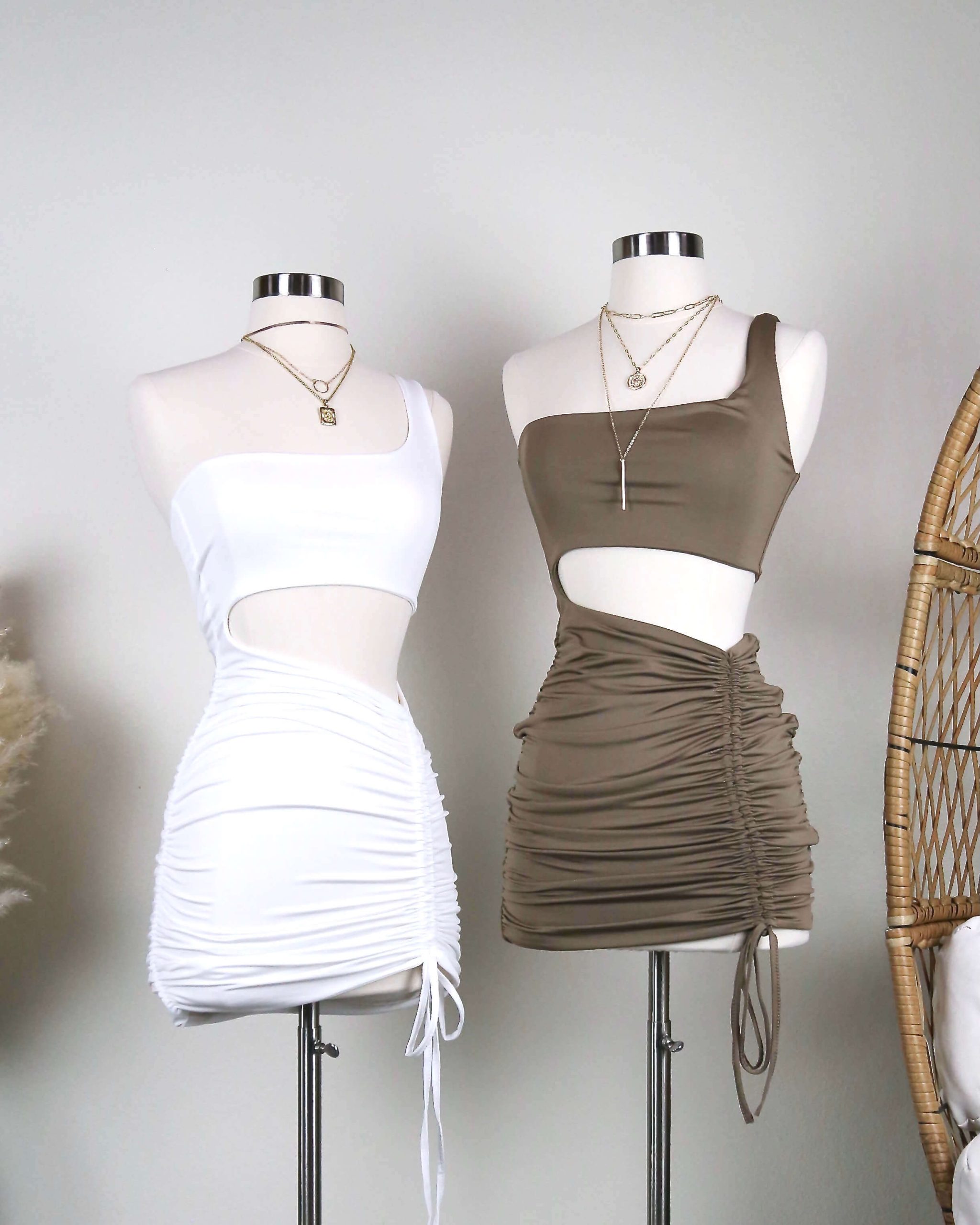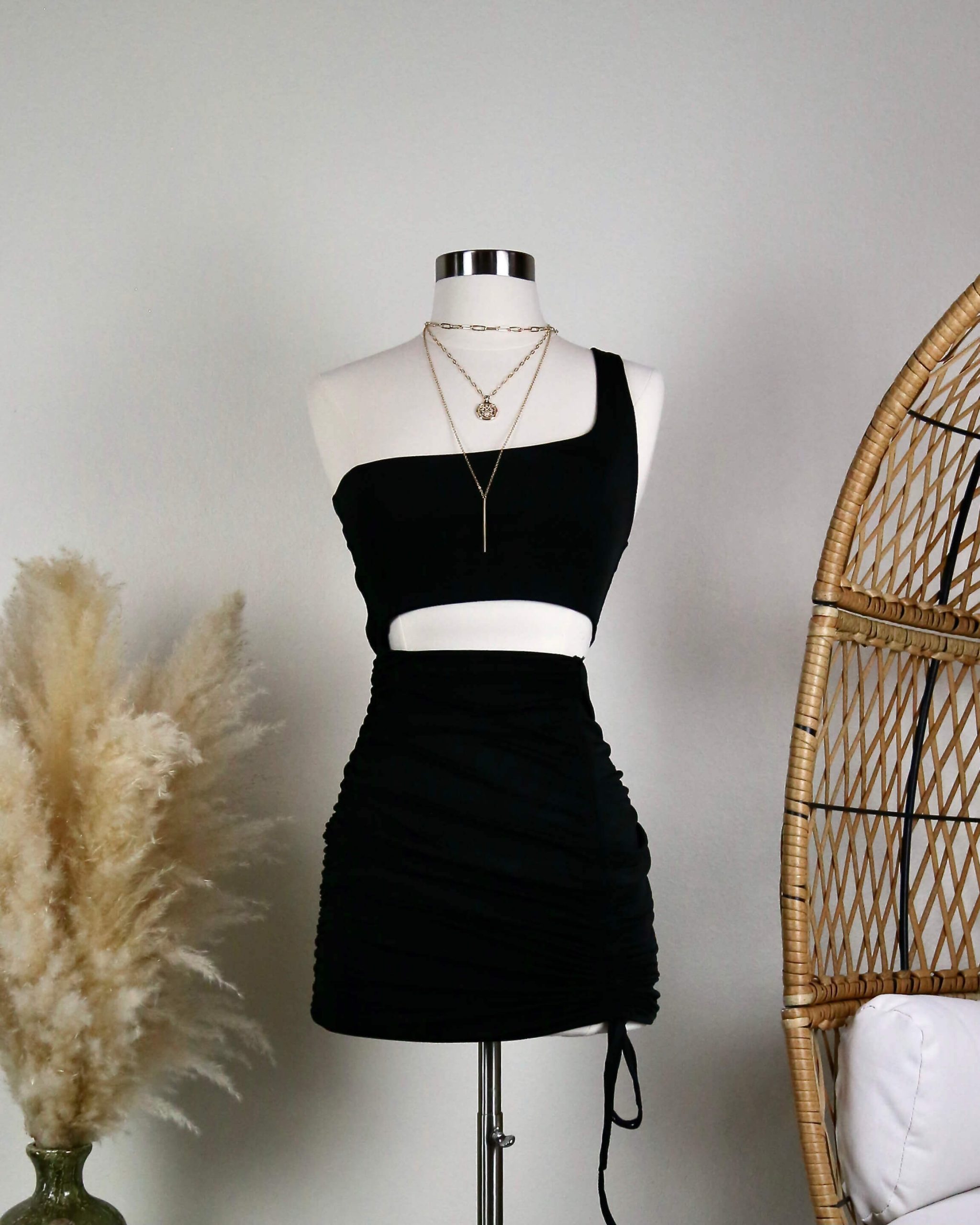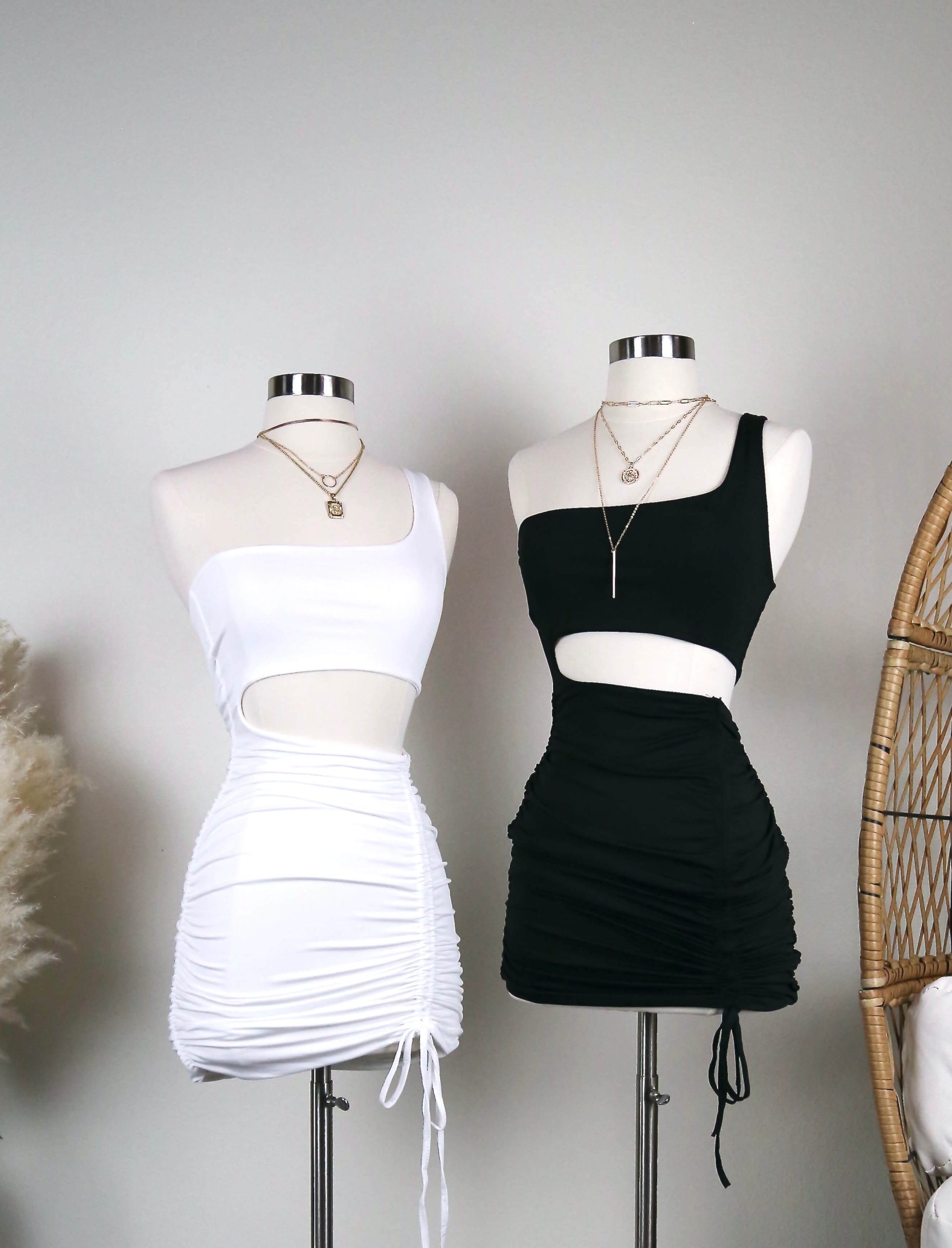 Be the life of the party in this trendy and edgy ruched one shoulder dress. The popular one shoulder neckline, double lined stretchy soft fabric, adjustable side drawstring and ruched detailing make this dress super flattering.