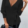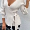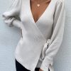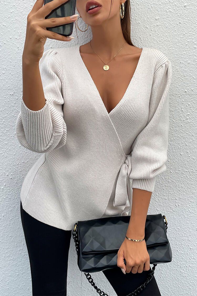 Sexy V Neck Balloon Sleeve Ribbed Wrap Knit Pullover Sweater