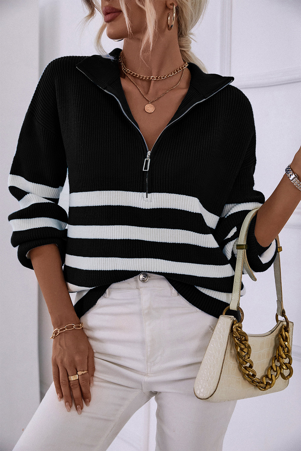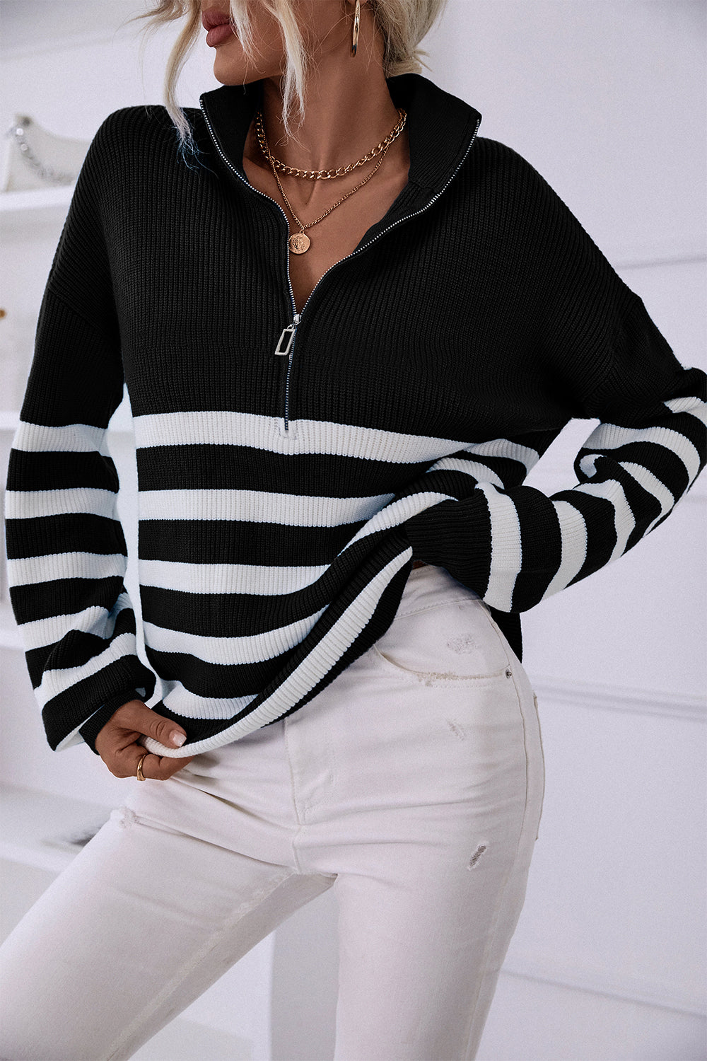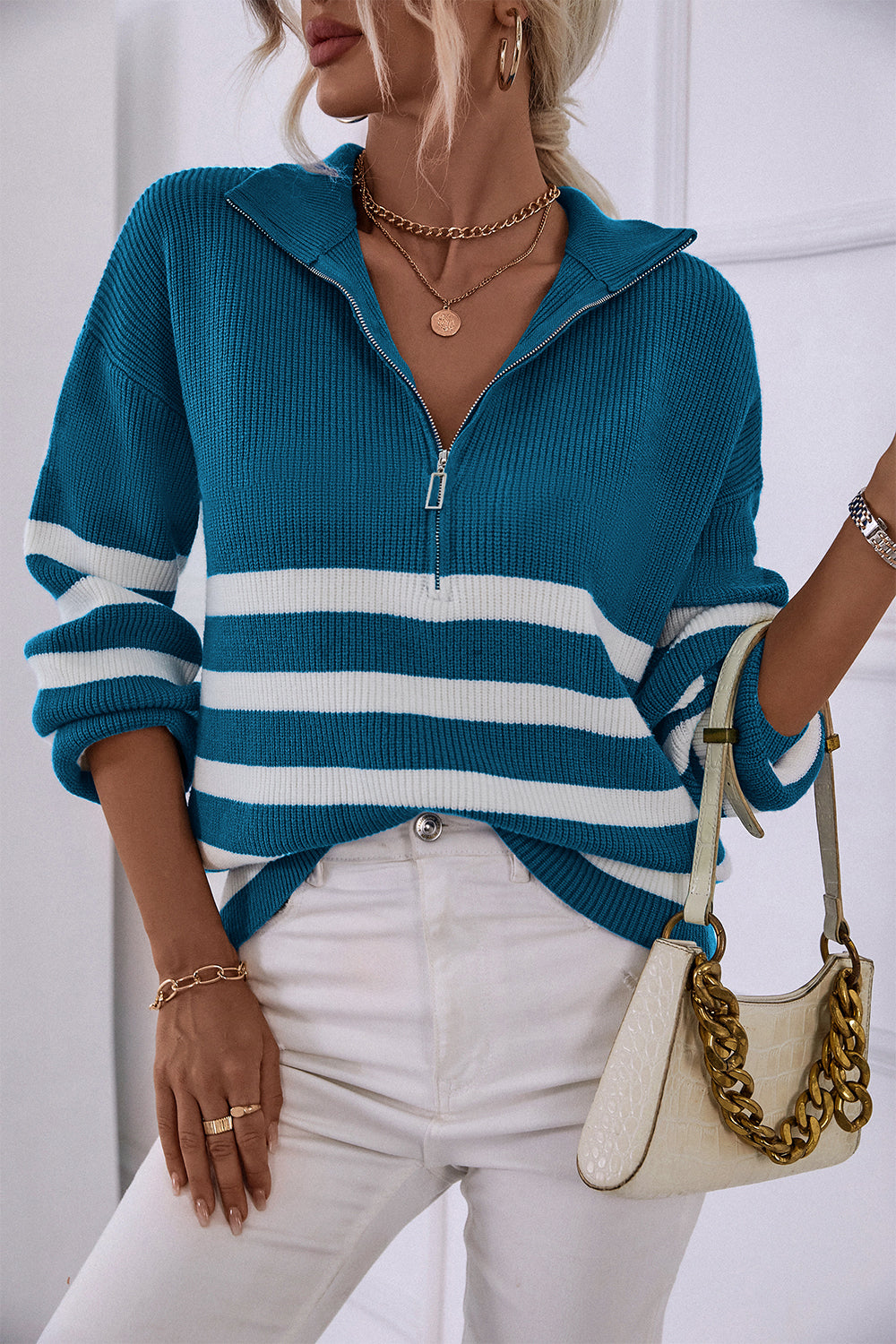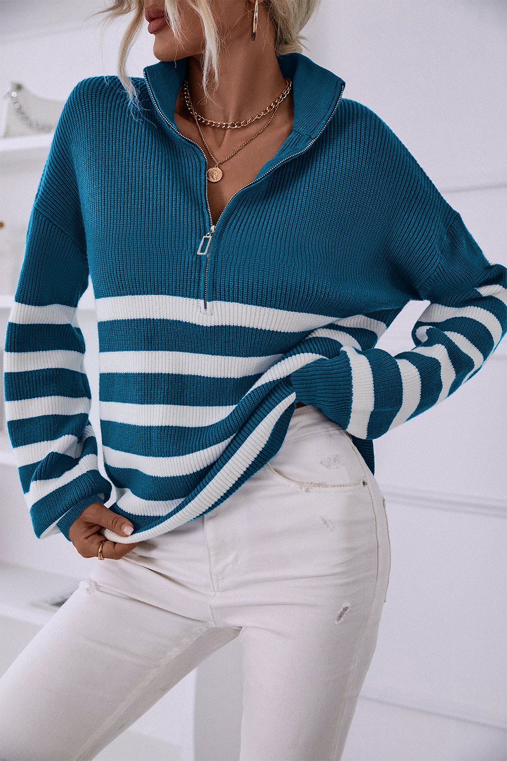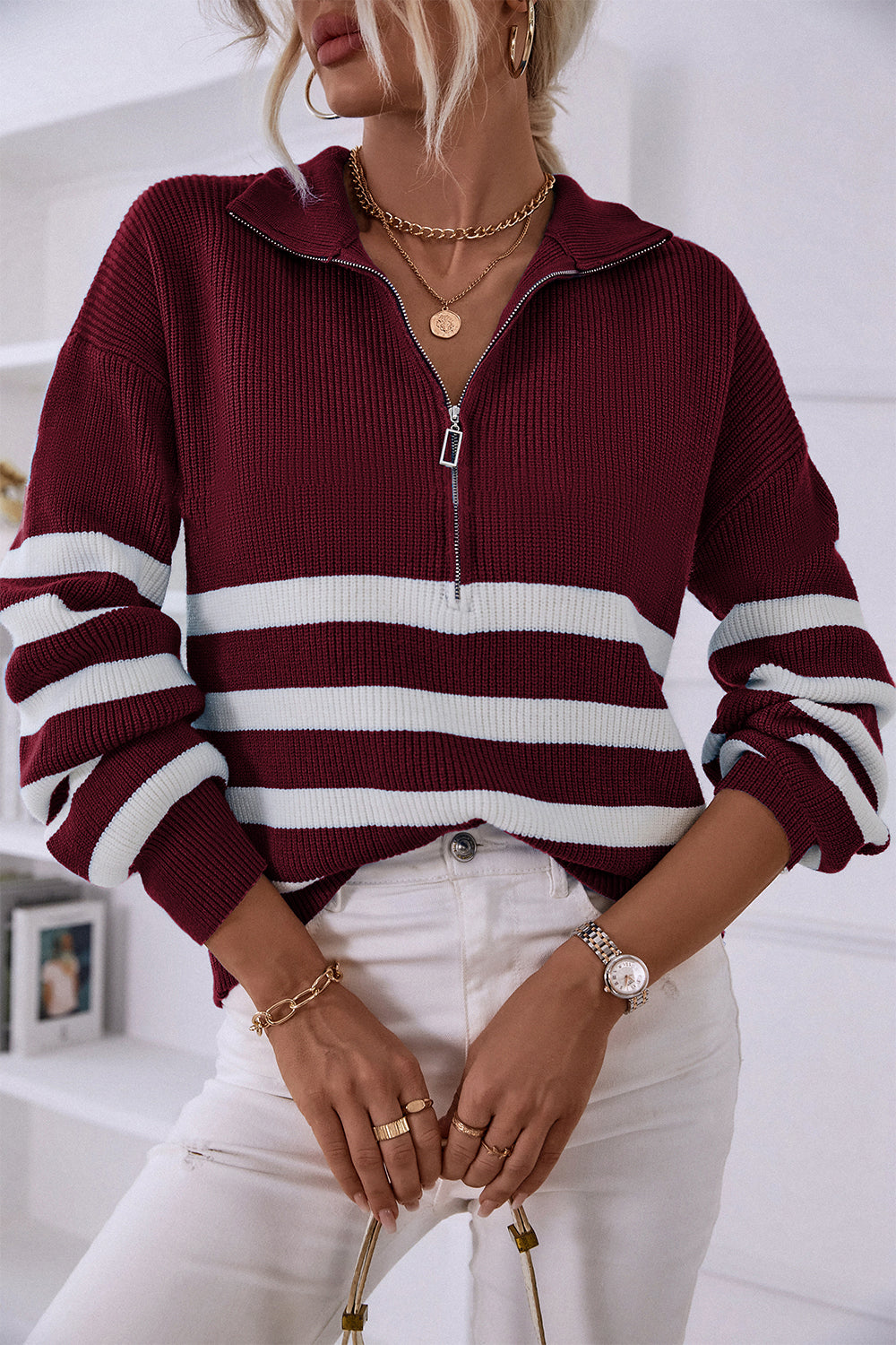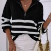 V Neck Collar Ribbed Knitted Stripe Pullover Sweater quantity